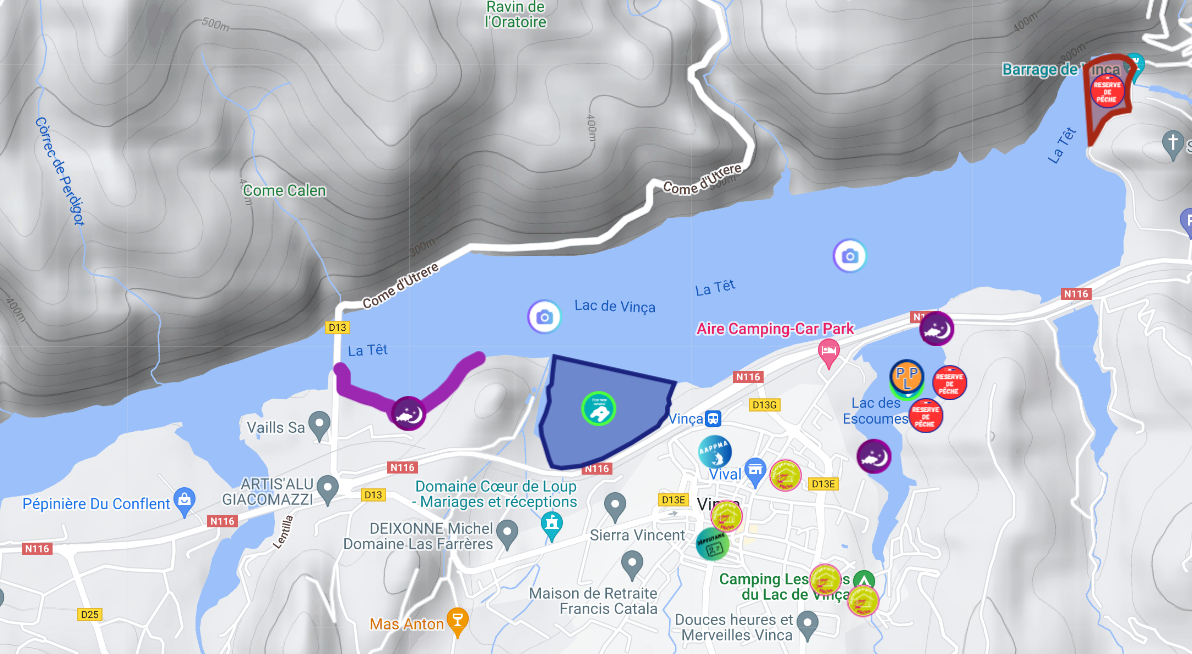 Pour préparer votre visite, téléchargez la carte du Lac de Vinça. Vous y trouverez les sentiers de randonnée, les aires de pêche et les zones de camping.